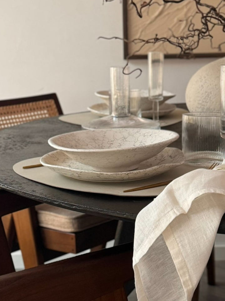 This set of handmade ceramic plates combines elegant design with practicality, featuring stunning marble patterns that enhance any dining experience. The Art of Dining collection celebrates sophistication and style, displaying meticulous craftsmanship and intricate details that add a touch of luxury to any table. These plates can be mixed and matched with other shapes and colors, creating a dynamic and stylish tablescape. Each piece is handcrafted in Spain with precision and care, ensuring a flawless finish that mimics the beauty of genuine marble. Not only are these plates visually appealing, but they are also durable and suitable for everyday use. Their versatile design makes them perfect for any occasion, while being dishwasher and microwave-safe for added convenience. Elevate your dining experience with our Ceramic Plate Collection, perfect for both casual and formal settings.