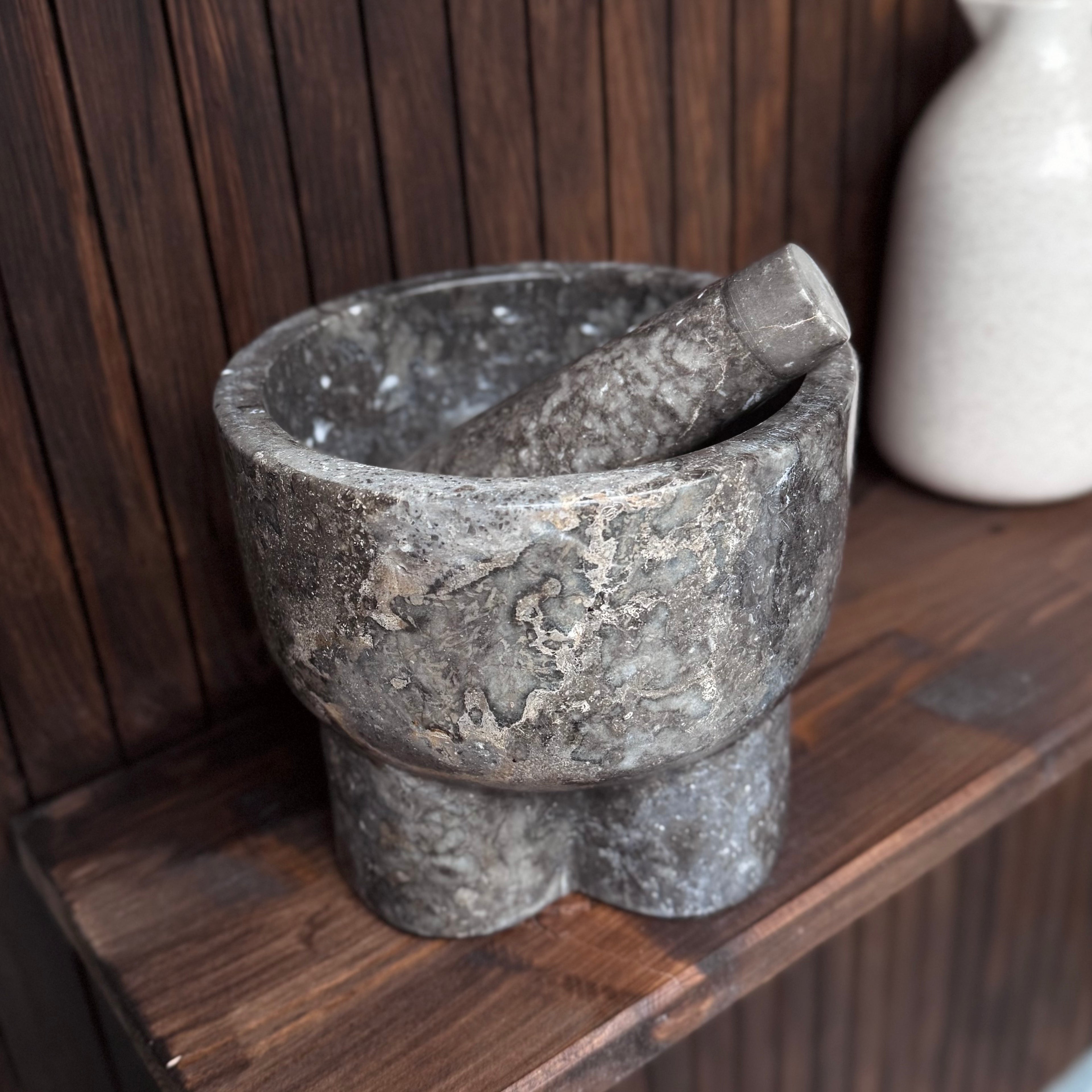 Equip your kitchen with the elegance of the House Doctor’s Kulti marble mortar, and let it become your essential tool for grinding spice mixes. This exquisite mortar comes complete with a matching pestle, exuding a seamless blend of color and style. Its sculptural shape adds a touch of raw sophistication, harmonizing beautifully with shades of grey and brown. Crafted from robust and decorative material, this mortar not only delivers functionality but also presents a visually stunning addition to your kitchen. Embrace the beauty and practicality of this stylish culinary accessory.