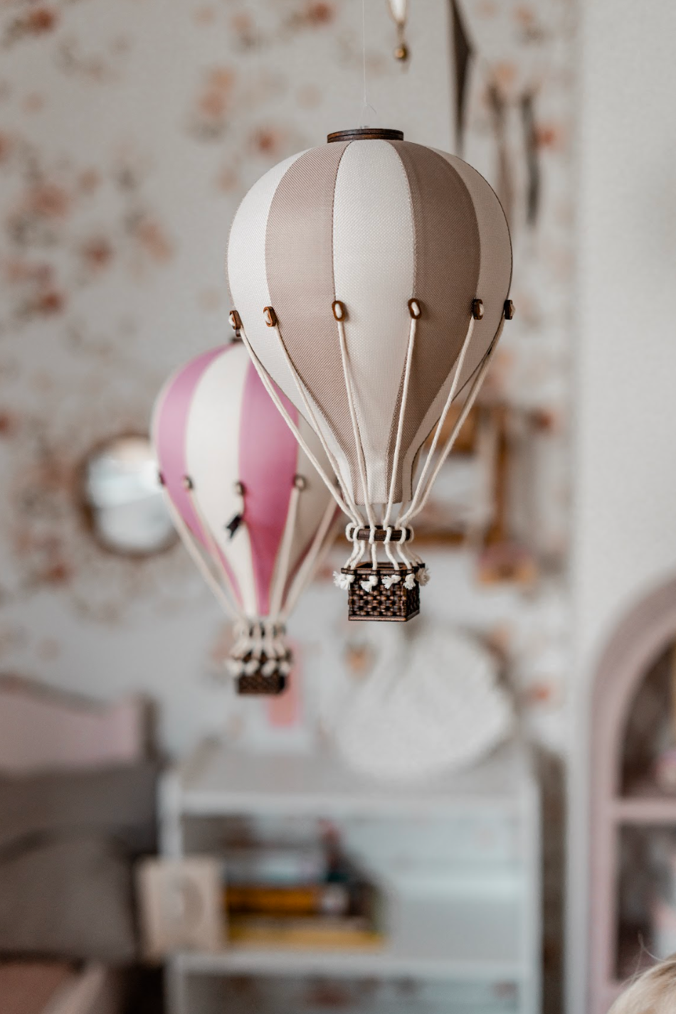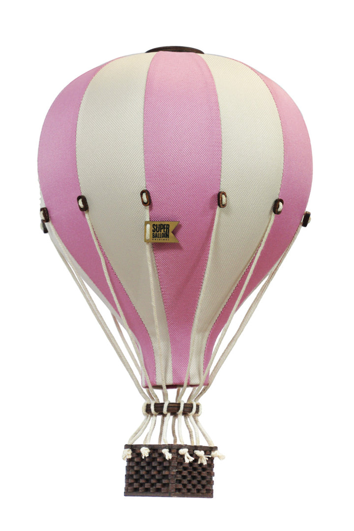 Stylish hot air balloon in pastel pink and cream stripes, featuring a decorative basket – perfect for adding charm and imagination to a child’s room or nursery.